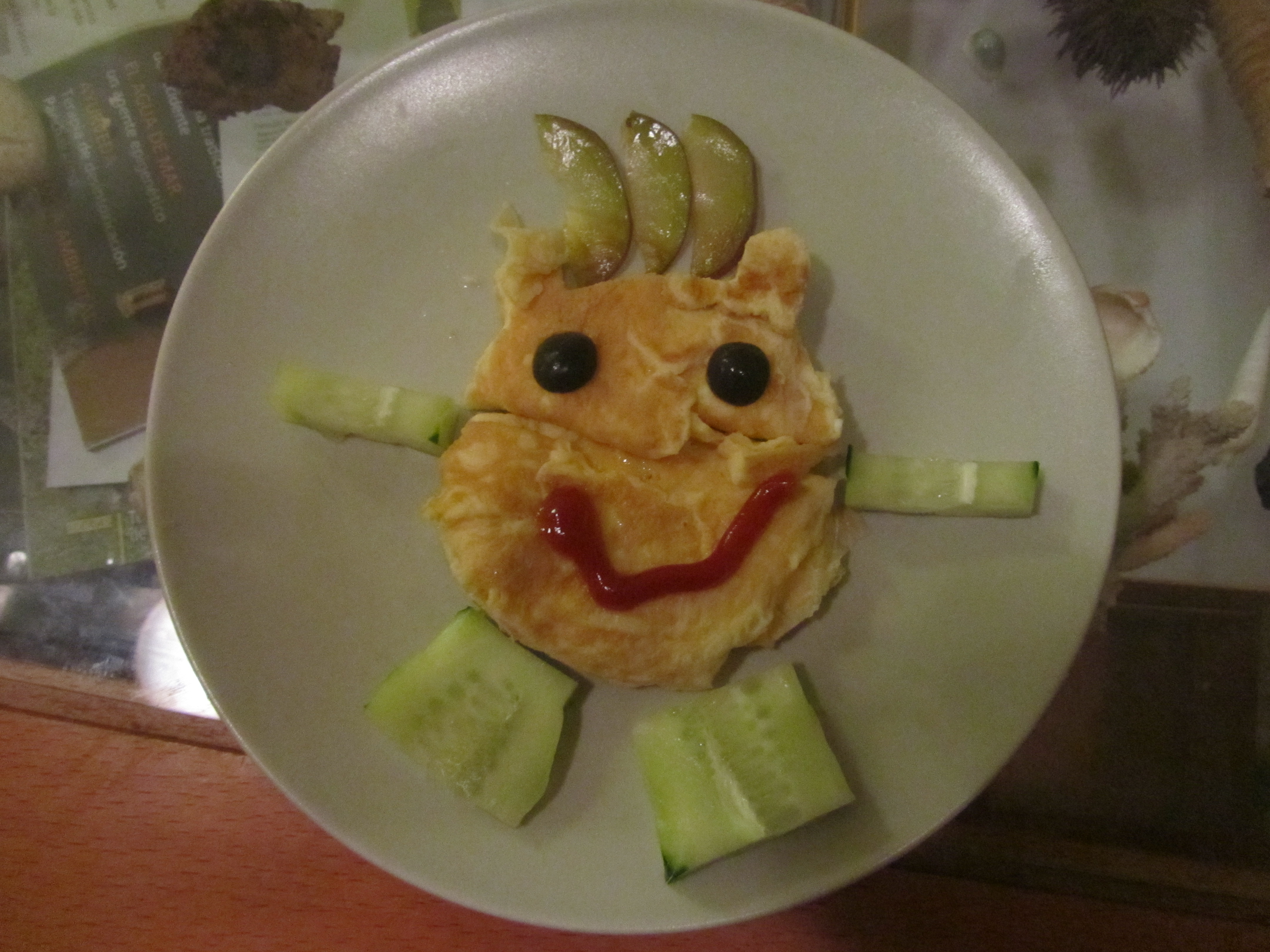 Quedó muy gracioso, pero vamos fue más gracioso lo de que lo mirara, se comiera los ojos de aceituna, rebañara la sonrisa con el dedo y pasara de lo demás del plato, jajaja (y eso que la ciruela que era el pelo eso sí otras veces se lo come fenomenal…)