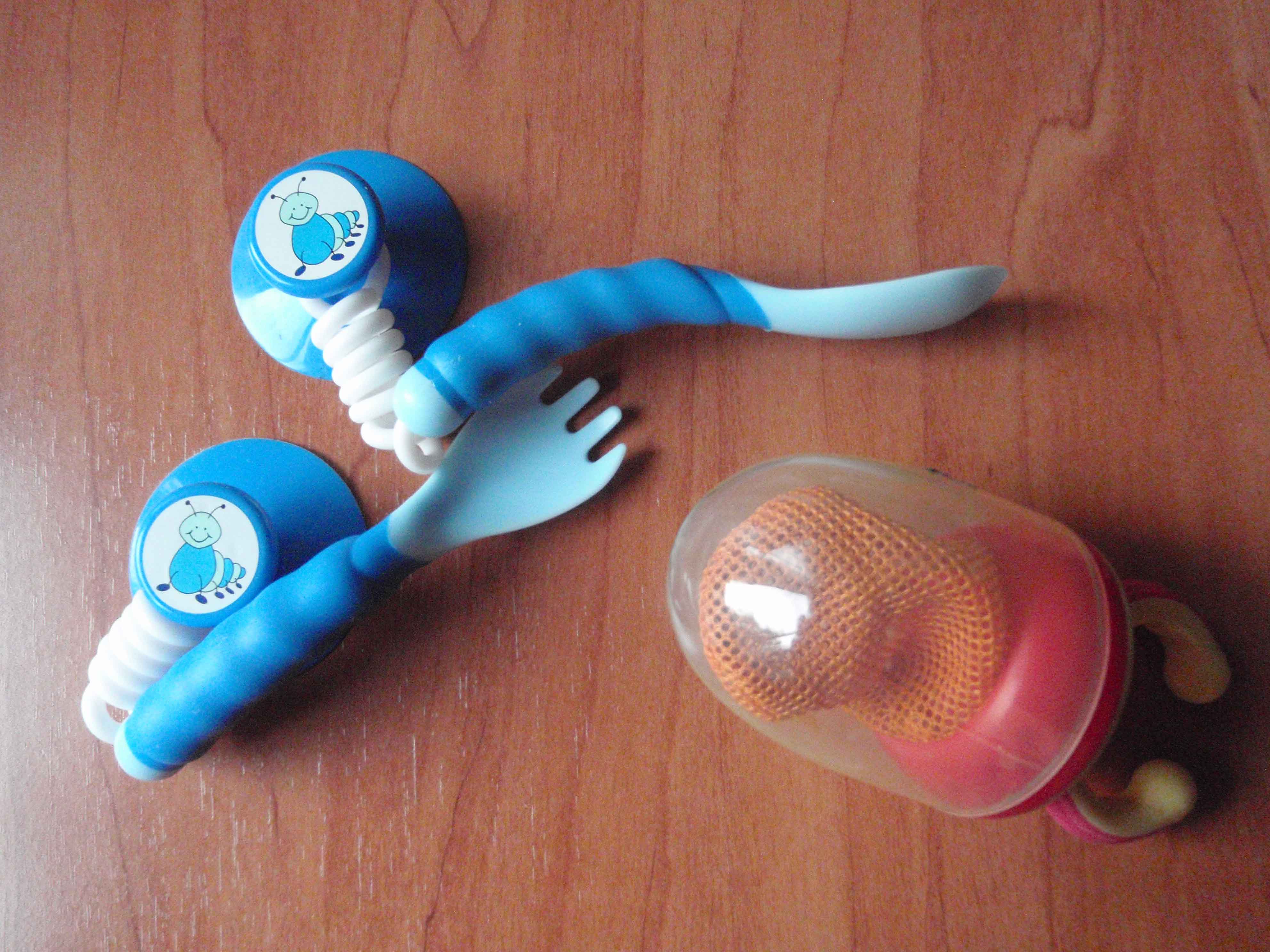 4- Cubiertos para aprender a comer (con ventosa y muelle, que giran…) Hay toda una variedad, pero yo no sé como usarlos, y al final es ‘peor el remedio que la enfermedad’, así que le dejo la cuchara de vez en cuando, le pongo un babero-delantal, y tengo a mano trapos…