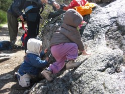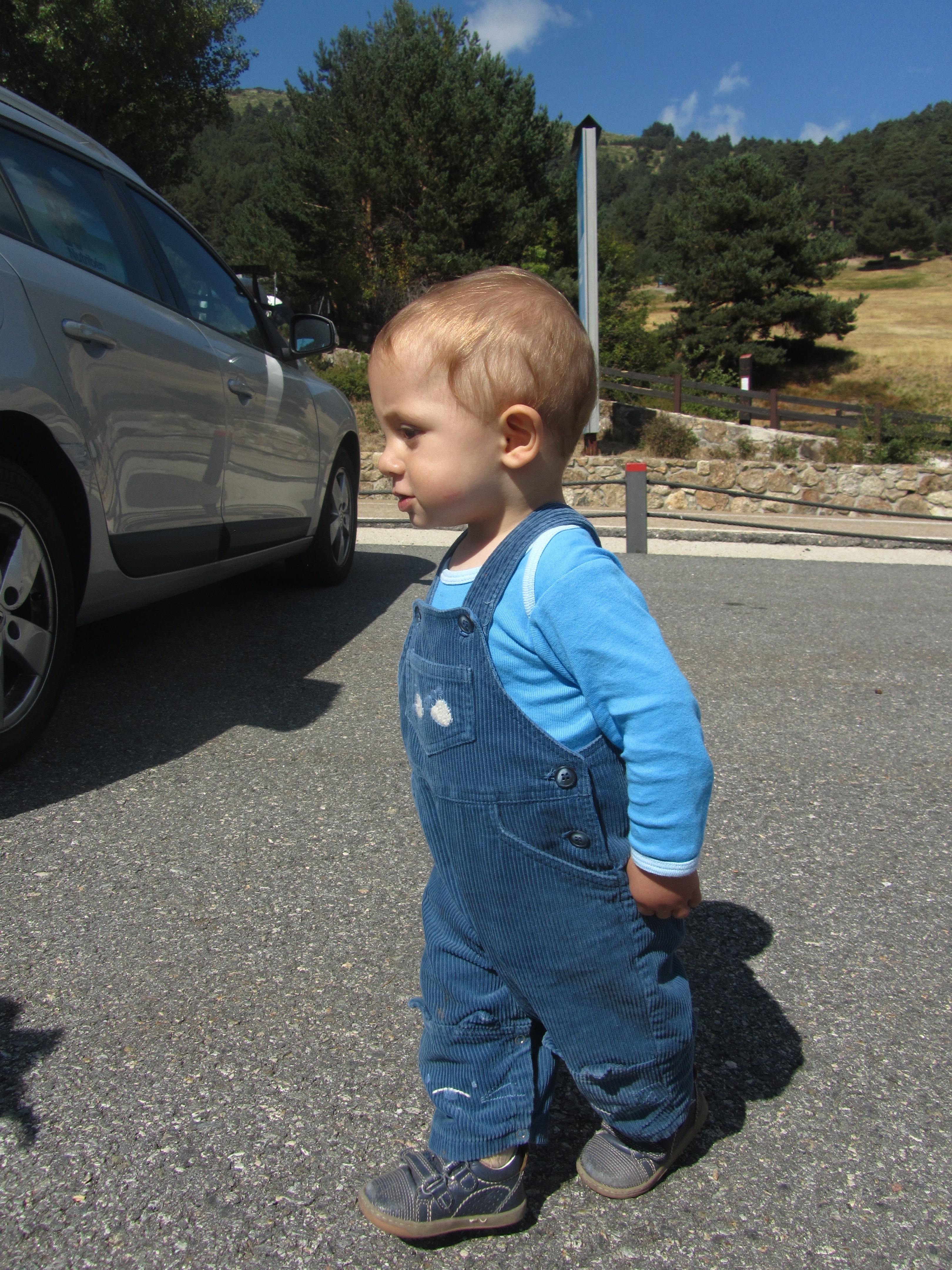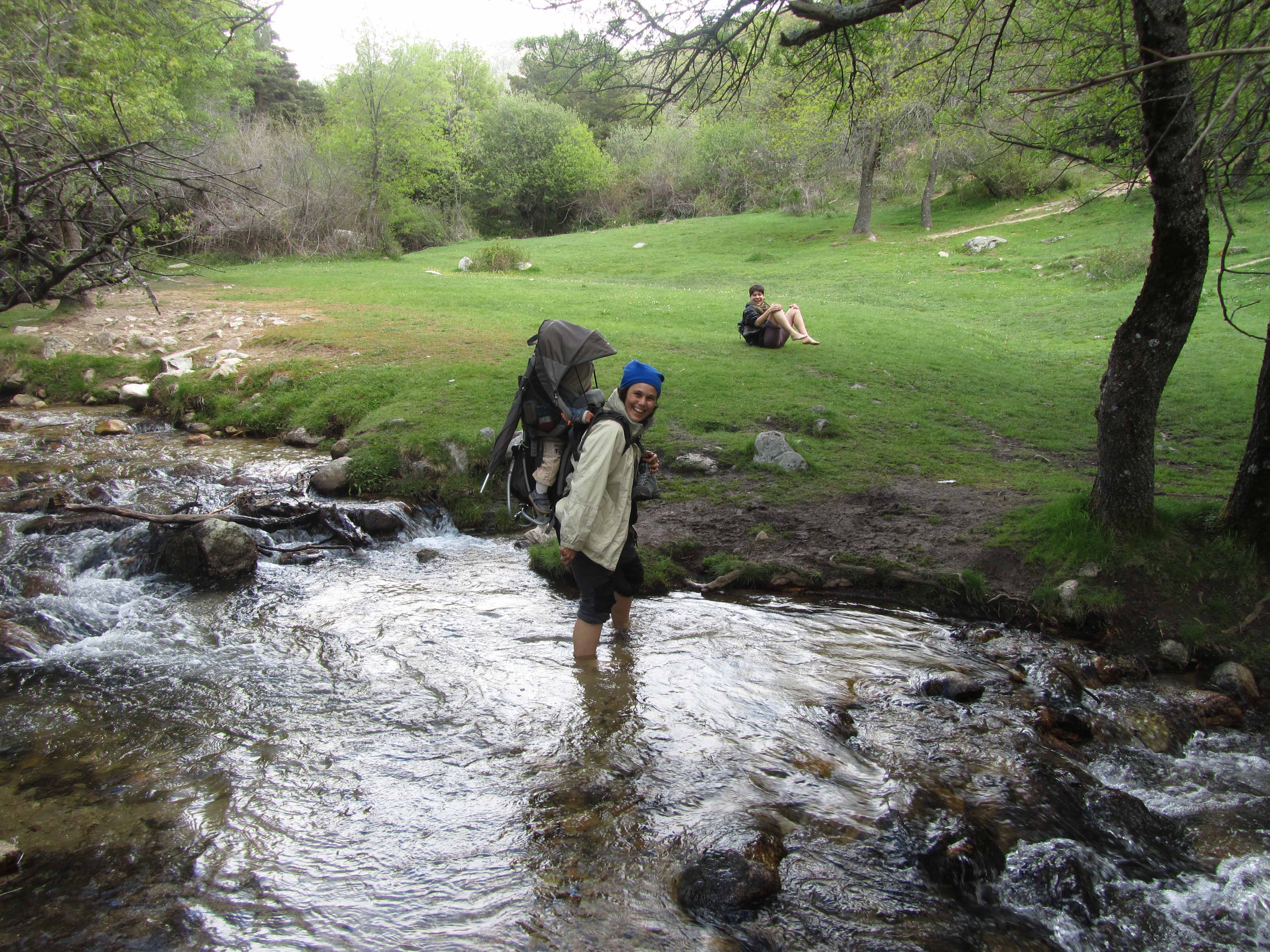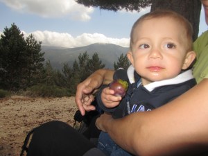 Arriba hay sitios planos donde parar, comer y dejar al bebote que se explaye, que ya necesita gatear y explorar ( a pesar de mis mejores esfuerzos por evitarlo, me encontré por la noche alguna piedra en el pañal…) Se lo pasó en grande con palos, piedras, y enseñandole todo a papá y mamá.