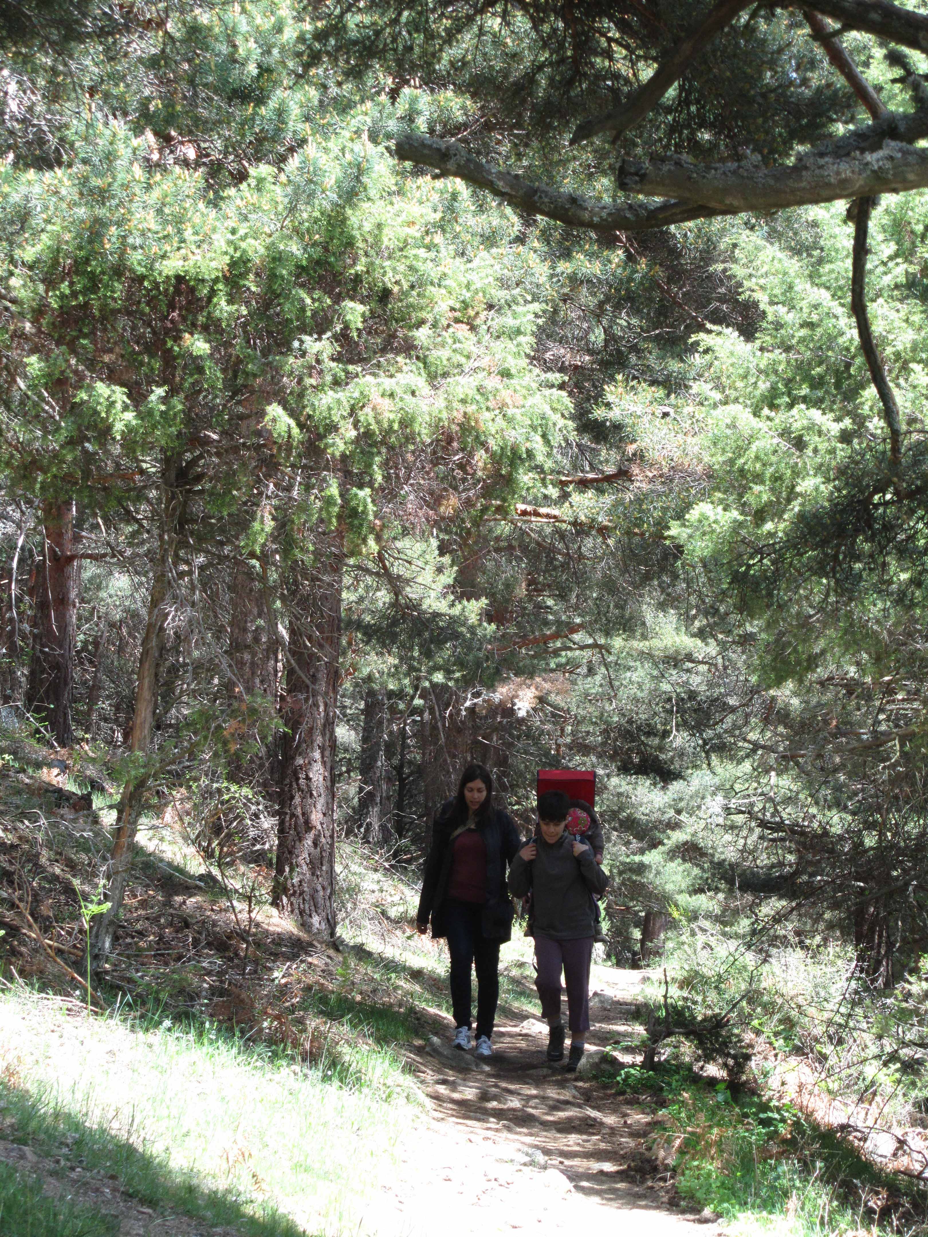 Para la excursión decidimos que la mochila grande la iba a usar otro peque de 3 años cuando se cansara de andar, y yo llevé a  a Nicolás en la ‘Manduca’ (mochila delantera para llevar al peque), porque si le llevo delante le doy más calor con mi cuerpo, y la verdad es que ese día no le apetecía mucho bajarse, estaba agustito con mamá. Es un complemento genial el forro con impermeable externo de la Manduca, lo he utilizado mucho también en ciudad; cuando le bajé para que andurreara le tuve que poner el abriguito.